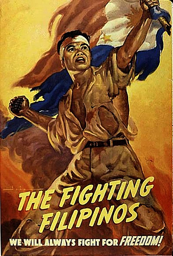 Poster na “The Fighting Filipinos” na likha ni Michael Rey Isip na ginamit upang humingi ng suporta para sa mga sundalong Pilipino.