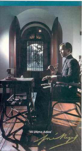Rizal habang nagsusulat sa loob ng kanyang kulungan sa Fort Santiago. Estatwang wax ni Guillermo Tolentino. Dambanang Rizal sa Fort Santiago, Pambansang Komisyong Pangkasaysayan ng Pilipinas.
