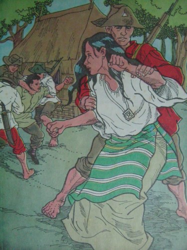 Nang bihagin si Aling Oryang nina Yntong. Guhit ni Ronelito Escauriaga mula sa Hiyas ng Kalayaan ng Adarna Books.