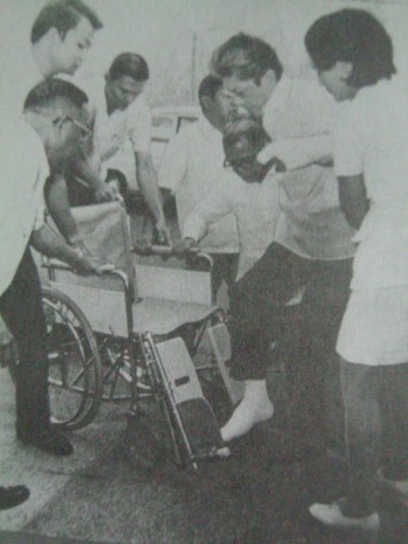 Si Gerry habang tinutulungang maupo sa kanyang wheelchair para mangampanya. Mula kay Senador Jovito Salonga.