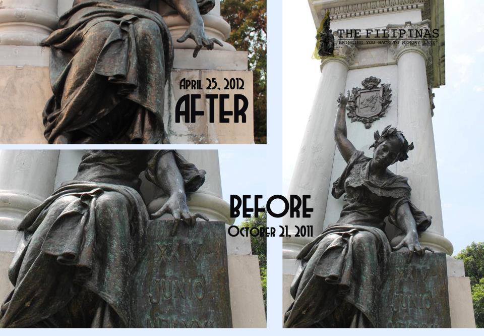 Ang dating kinalalagyan ng plake at ang estatwa ngayon sa ilalim ng Legazpi-Urdaneta monument noong wala na ito. Pati daliri nawala. Kaloka. Mula sa nostalgiafilipinas.blogspot.com.