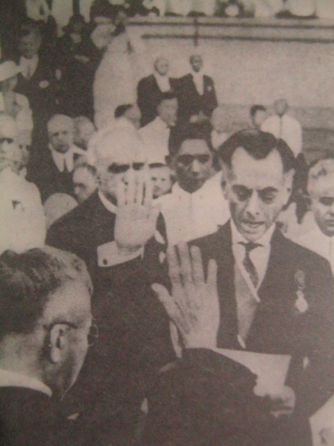 Ang panunumpa ni Quezon bilang Pangulo ng Komonwelt sa harapan ng gusali ng lehislatura (ngayon ay National Art Gallery) noong November 15, 1935. Mula kay Carlos Quirino.