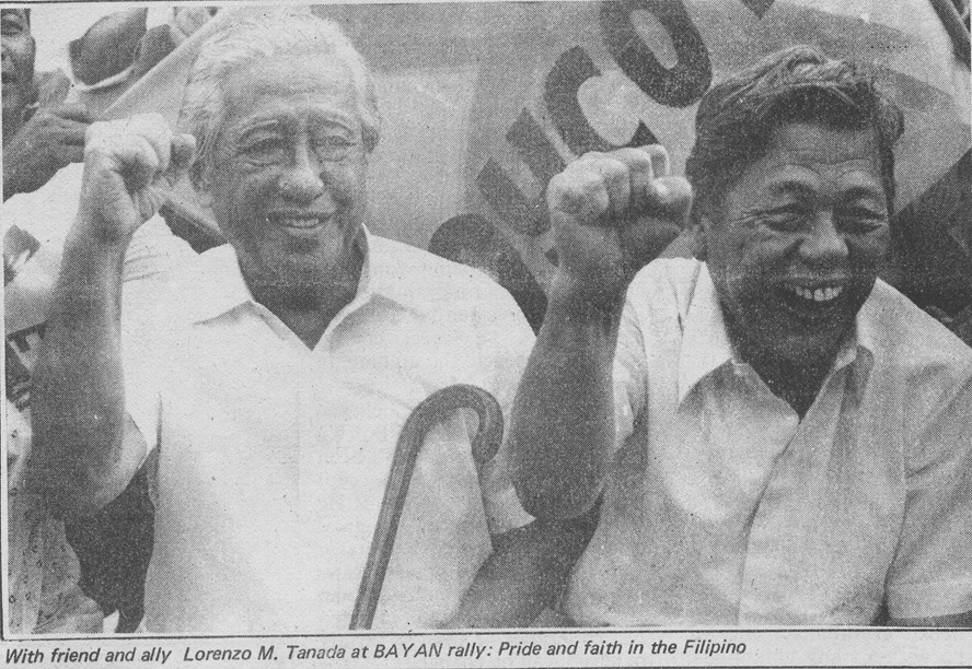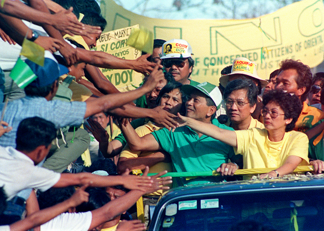 Si Doy Laurel, ang bise presidente ng EDSA, habang nangangampanya kasama ang Pangulong Cory Aquino noong 1986 Snap Presidential Elections. Mula sa Washington Post.