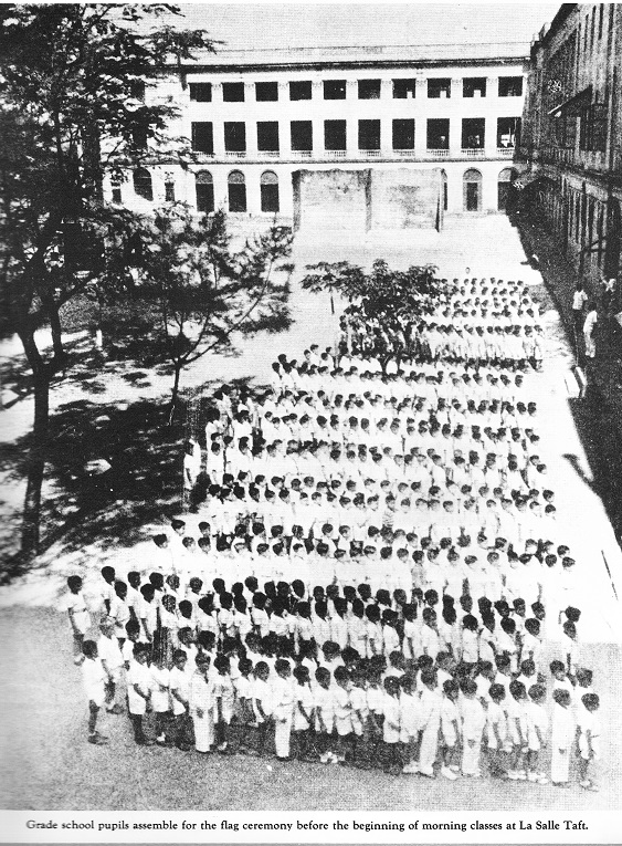 Ang mga estudyanteng lalaki ng DLSC ay nagtipon-tipon para sa flag ceremony, makikit sa larawan ang softball court na tinanggal noong Dekada 1980. Ngayon ay Amphitheater na. Mula sa La Salle: 1911-1986.