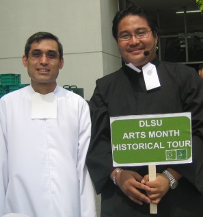 Si Xiao Chua bilang si Brother Flavius Leo (isa sa namatay noong masaker ng 1945) para sa isang campus tour, kasama si Brother President Ricky Laguda, FSC., February 2013. Mula sa Sinupan ng Aklatang Xiao Chua.