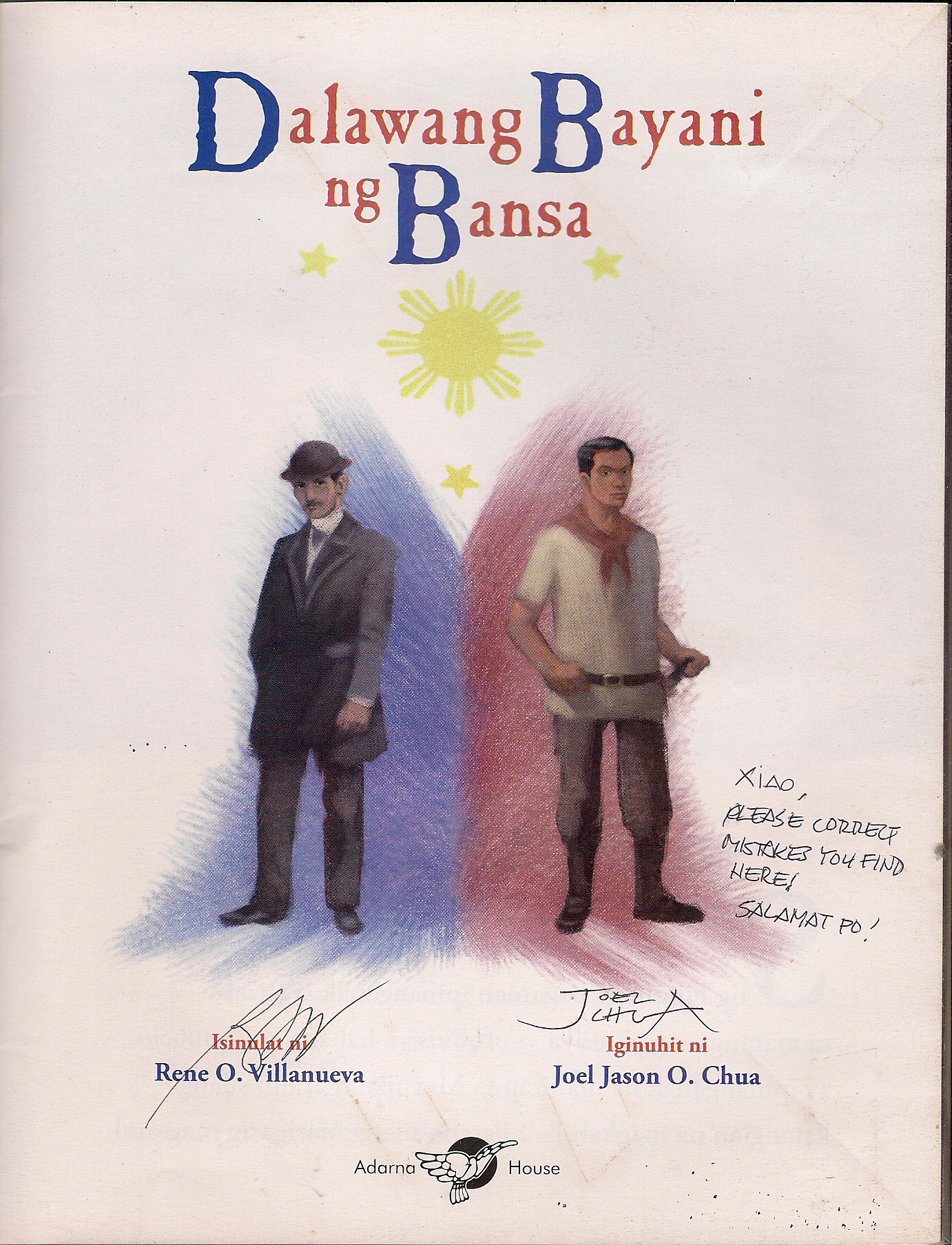 Ang kopya ng "Dalawang Bayani ng Bansa" na nilagdaan ni Rene Villanueva para kay Xiao Chua.  Mula sa koleksyon ng sinupan ng Aklatang Xiao Chua.