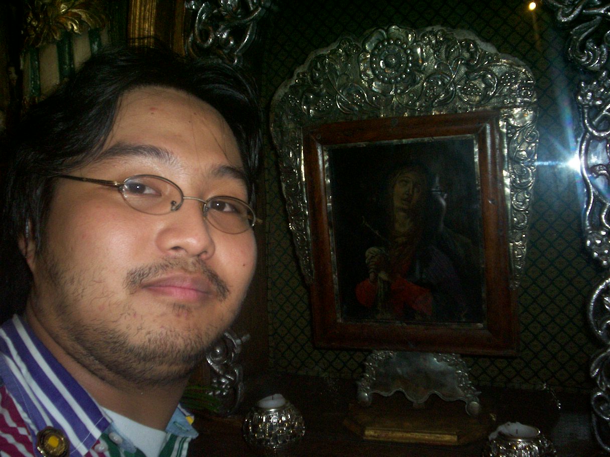 Si Xiao Chua sa harapan ng orihinal na larawan ng Mahal na Birhen ng Turumba na sinasabing natagpuan sa lawa at nang iahon hindi mabuhat, ngunit nabuhat na lamang patungo sa simbahan nang ito ay sayawan ng mga tao. September 2, 2007. Mula sa Sinupan ng Aklatang Xiao Chua.