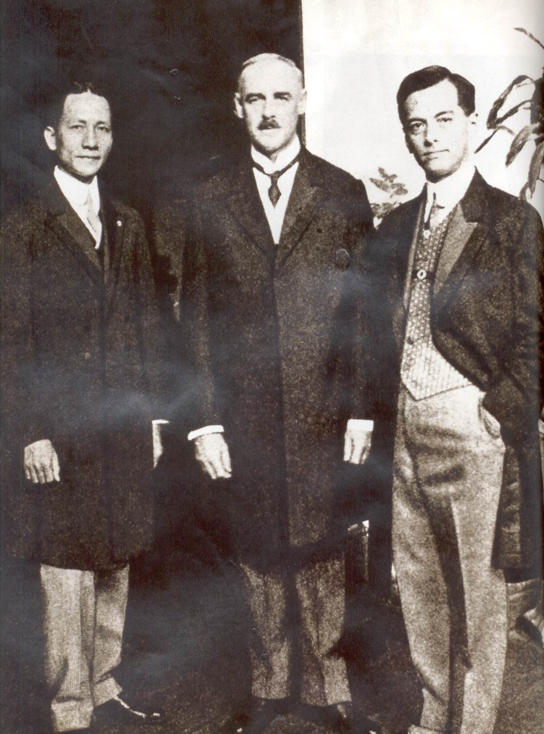 Si Guillermo Tolentino (sa gitna) at ang kanyang protege na si Anastacio Caedo (sa kanan). Kahawig ng katawan niya ang katawan ng Oblation. Mula sa peysbuk ni Dr. Ambeth R. Ocampo.