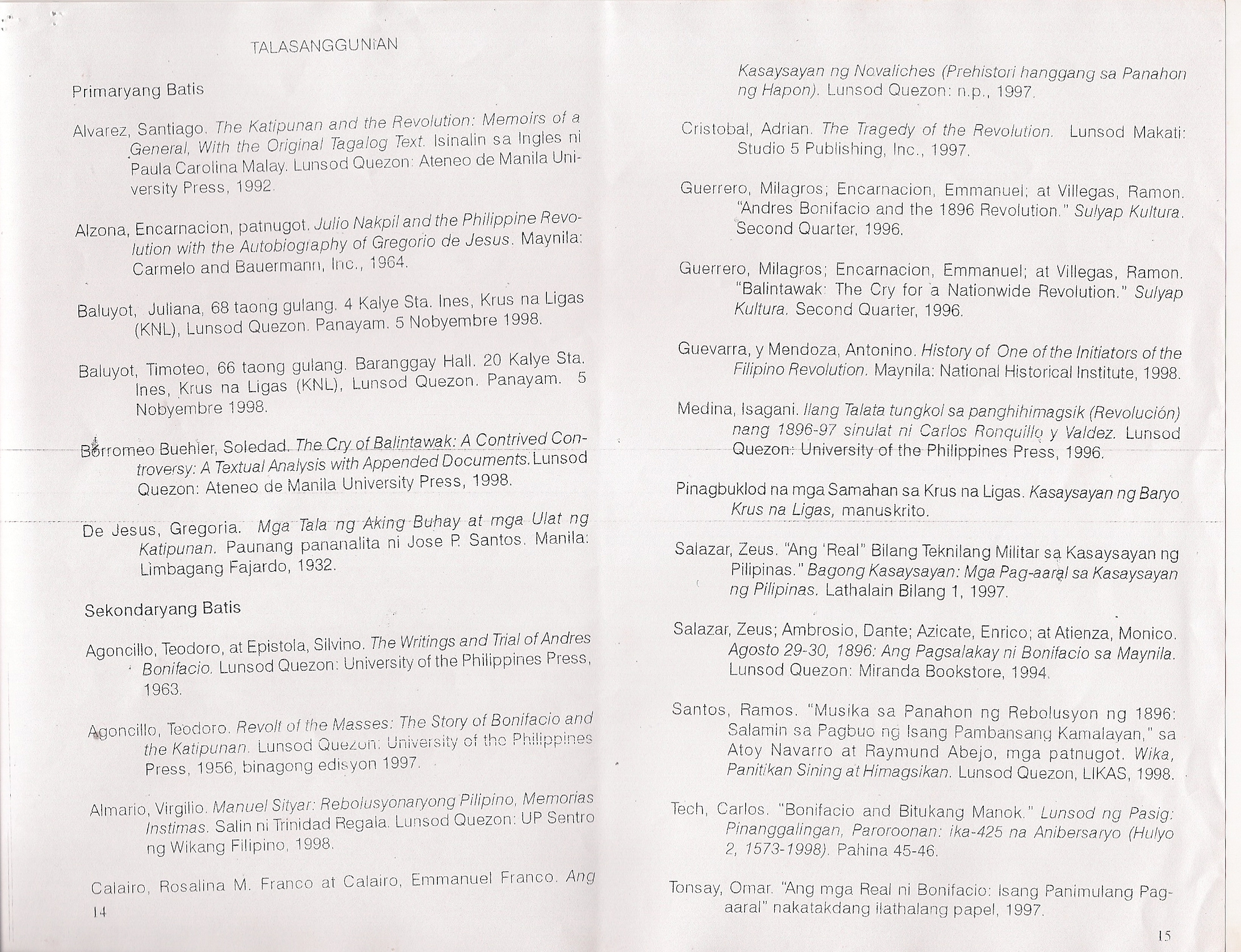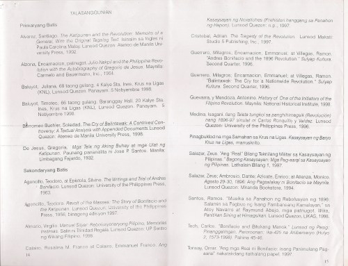 Guerrero, Milagros C. “Pagtanaw sa Kasaysayan, Paghahanda sa Himagsikan: Mga Ideya ng Katipunan, 1892-1897,” Kasarinlan: A Philippine Quarterly of Third World Studies, Vol. 14, Num. 1, 1998, pp. 37-52.
