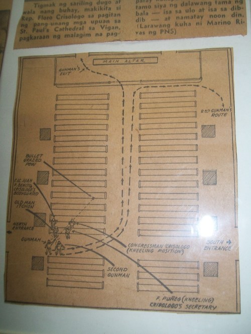 Habang nakaluhod at nagdarasal sa isang misa sa St. Paul’s Cathedral sa Vigan, Ilocos Sur, si Congressman Floro Singson Crisologo, bigla na lamang itong binaril sa likod ng kanyang ulo, at habang nakahandusay, may isa pang lalaking bumaril sa kanyang puso. Tumakas patungong Plaza Burgos ang dalawang salarin at naglaho sa mga makasaysayang kalye ng Vigan.