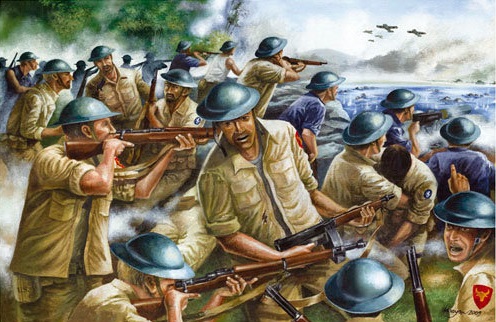 Ang isa sa mga kanyon ng Corregidor habang pumuputok noong Labanan sa Corregidor. Mula sa Corregidor ni Alfonso Aluit.