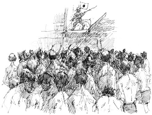 Isang sundalong nag-eenjoy mangabayo sa harapan ng Post Headuarters. Mula sa Corregidor ni Alfonso Aluit.